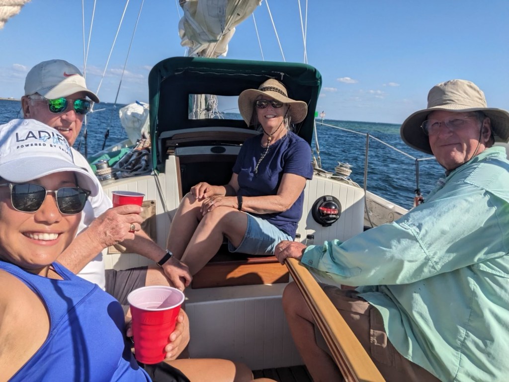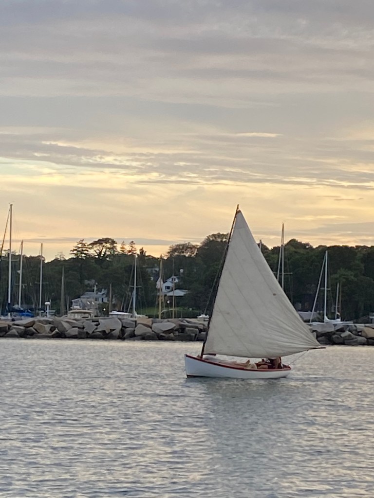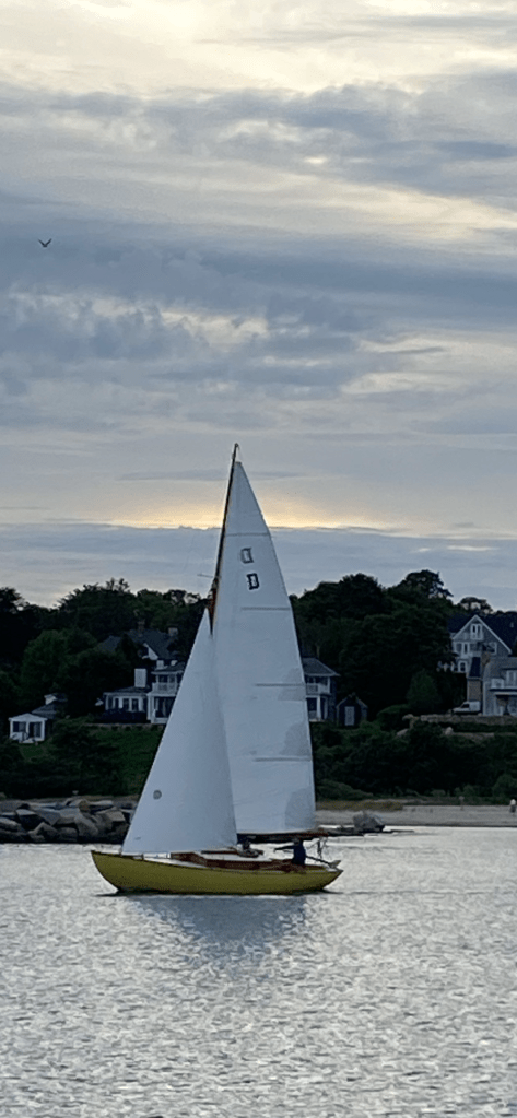 Today, Eric’s former Thistle crew Linda from the 1980’s and 1990’s came up for a sail on Thistle. We had a great brunch at Trip’s and a feisty sail. We were going 7 knots with a reefed main and staysail. It was nice having experienced hands with the wind gusting in the 20’s. On Monday, Eric shortened the boom and it was the first sail since the rigging change.