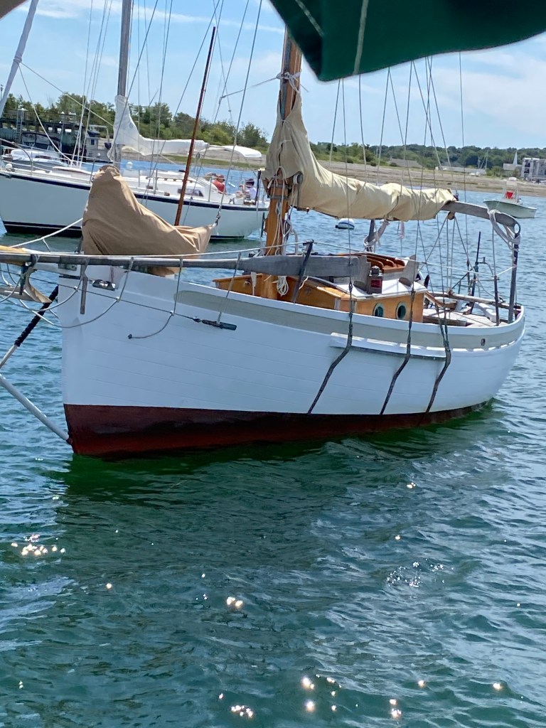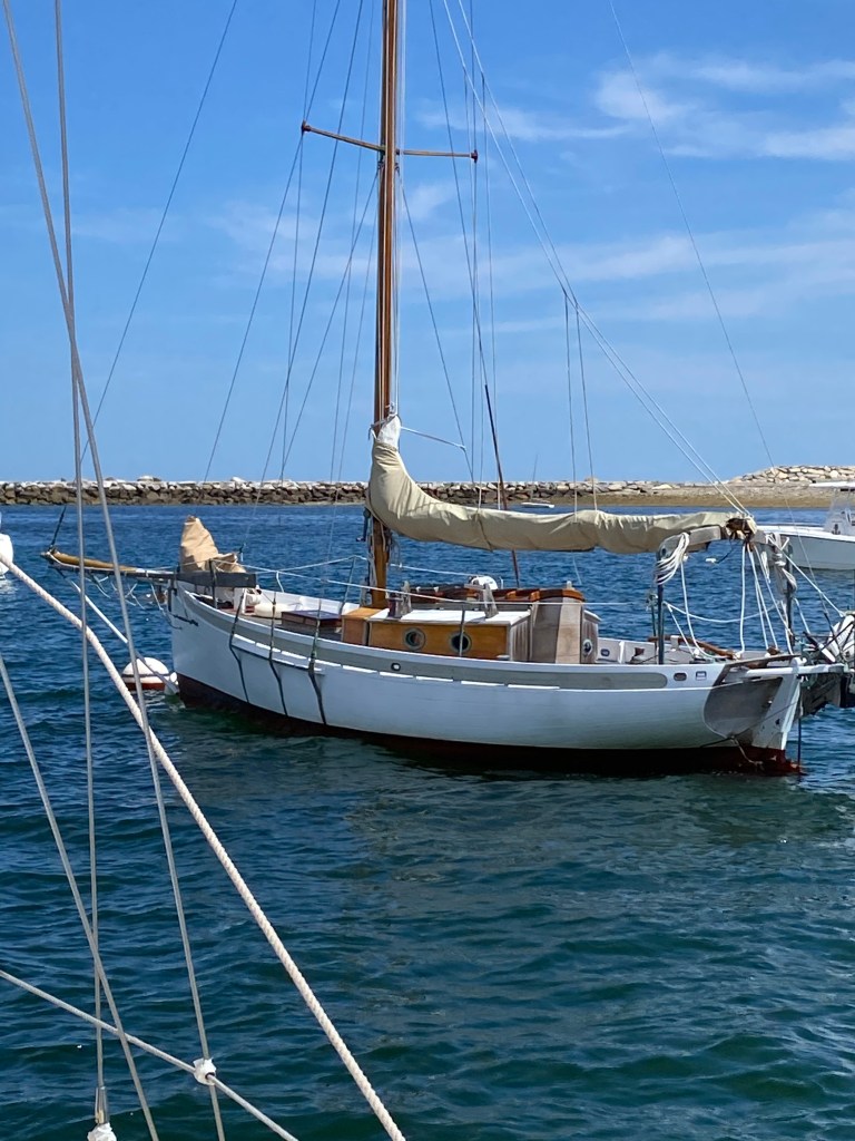 It’s a long run from Gloucester to the Cape Cod Canal. We heard rumors the famous boat Seraffyn was in Scituate, Ma so we sailed in that direction. We had a nice sail down. Sure enough upon entering the harbor there she was! Our boat is a slightly enlarged version of Seraffyn. Lin and Larry Pardey built her in 1968. They wandered and eventually circumnavigated the globe. Keep in mind she is a 24 foot wooden boat with no engine, electronics, or head! They navigated by the stars. Larry was a fabulous sea man trained in the old ways. Lin’s reputation as an off shore crew is second to none.