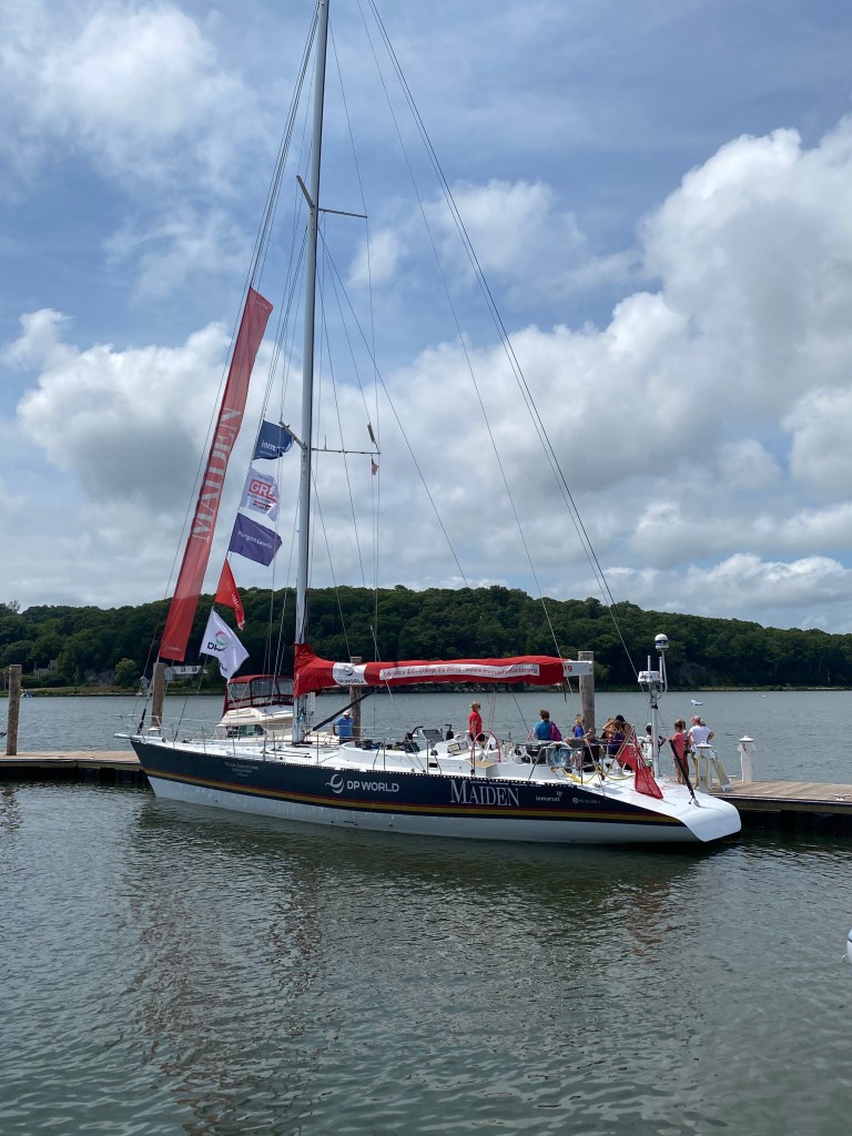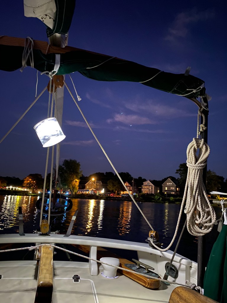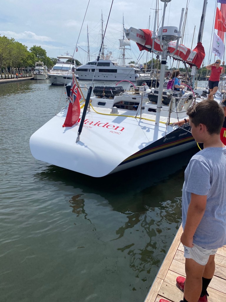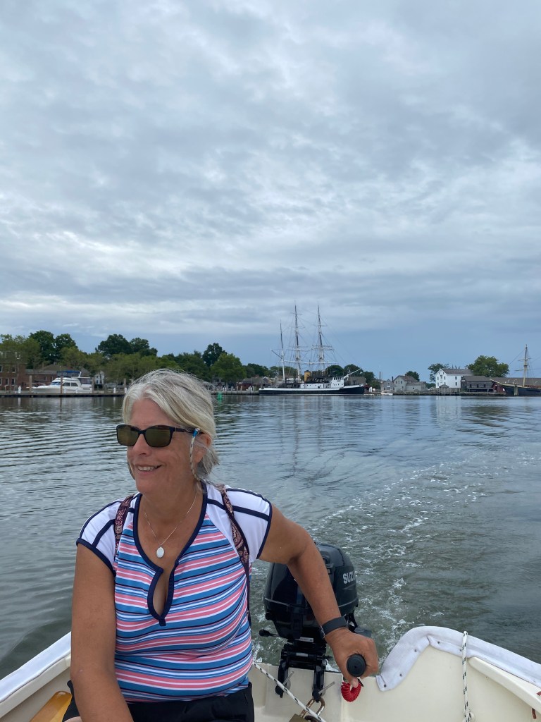 Tuesday we caught a fair tide and made record time sailing to Mystic. Catching a fair ride can increase your boat speed by 40 percent. Otherwise you will be eating tide – not fun! We were able to anchor in our favorite spot in front of Mystic Seaport Museum. The seaport has a special boat on display Maiden. Maiden was the first boat raced by an all female crew in the Whitbread round the world race. The experts were stunned when the girls won two difficult legs in the southern ocean. The boat was saved from the scrap heap and restored to racing condition. The boat is used to promote women sailing and education programs similar to Stem. Eric had a tour of the boat and was impressed it’s such a rock solid ocean racer. Dawn Riley from Detroit was on the boat originally 32 years ago. Check out the movie Maiden to learn more.