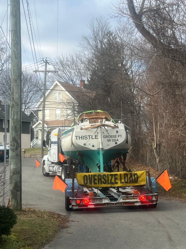 It’s been a journey – Thistle was trucked from Branford, Ct. to Ruskin, Fl. Coordinating the move of a boat is exhausting. Eric and I spent a week packing the boat. It’s like packing your house to go 60 mph. Every item has to be wrapped and secured either in or on your boat. We purchased ratchet straps, cargo blankets, and a lot of tape.