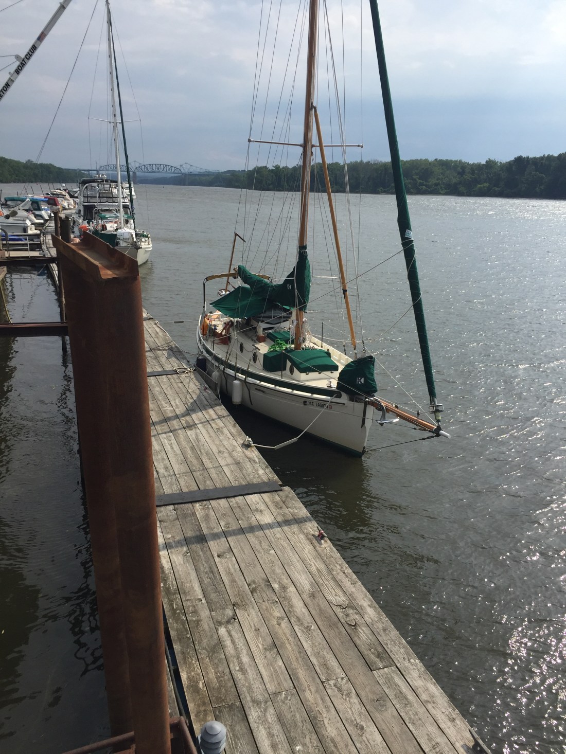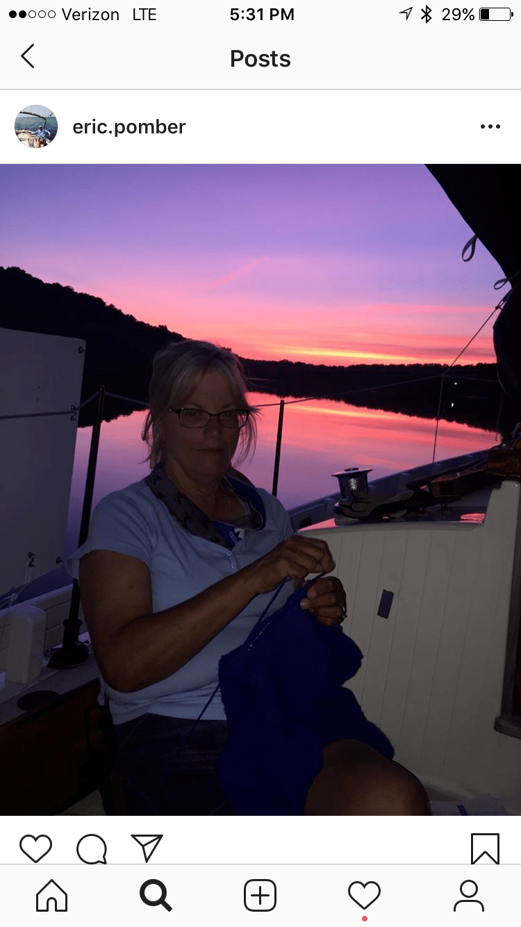 We are currently at Castleton Boat Club. They offer a DIY gin pole for $50. I assumed incorrectly other sailors would be working with Eric while I spent the day knitting. The members can not help because of insurance restrictions and no other transient boats were around. Eric is always optimistic about what I can do. I ran the crane and at one point man handled the mast. It’s the first time I’ve had a piece of the action and I kept saying I owe Tim Sarns big time.