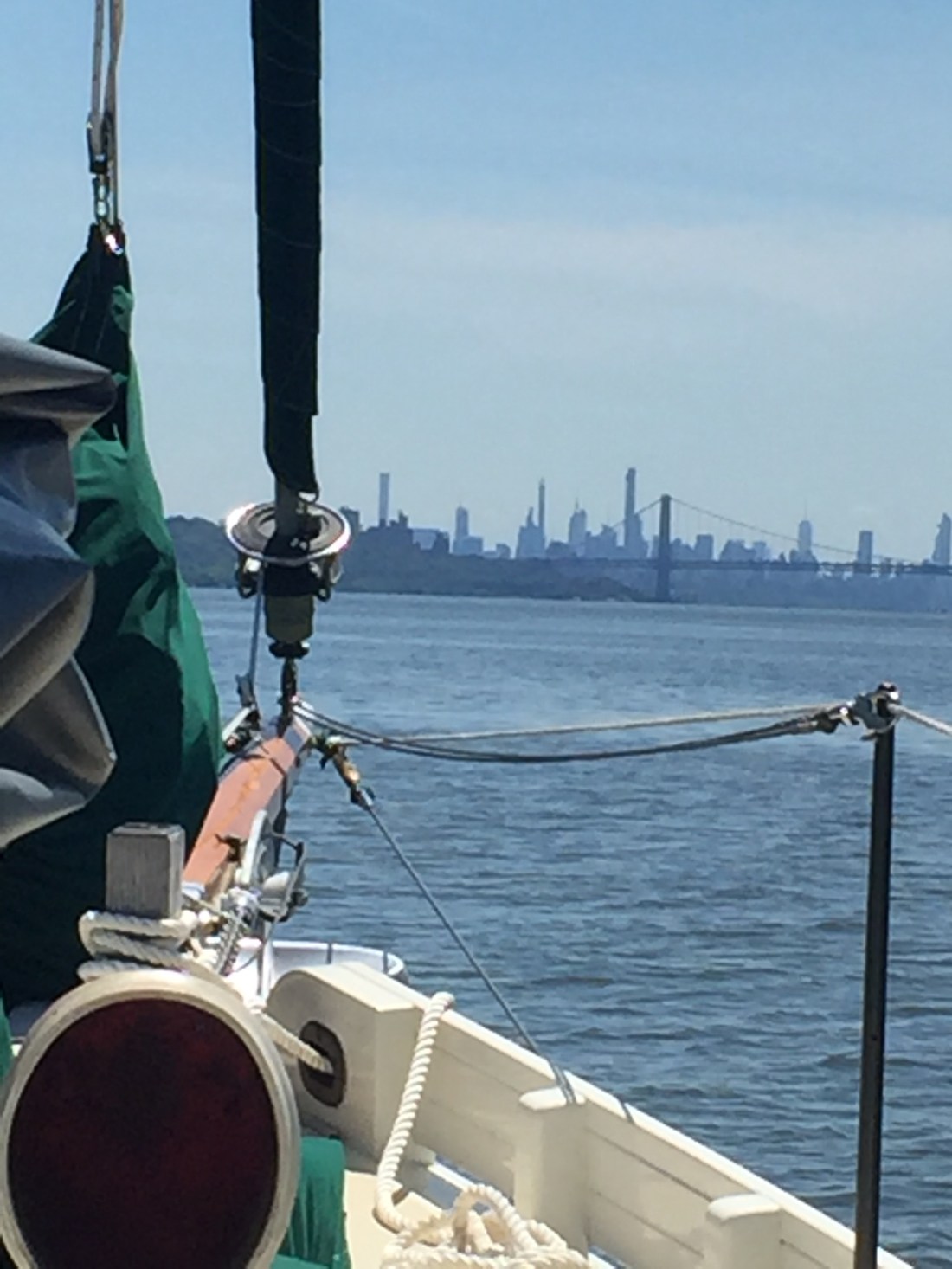 On Tuesday we headed to Oyster Bay. The trip to Oyster Bay included motoring the length of the East River (from the southern tip of Manhattan near World Trade Center to Long Island Sound). We started the trip at 5 am to catch a fair tide and were rewarded with a beautiful sunrise and a fast ride. The East river is not a river at all. It is a tidal estuary that separates Long Island from the mainland. The current flows very fast in both directions depending on whether the tide is coming in or going out. At the Long Island end there is a narrow spot called Hell’s Gate where the water flows faster than our boat will go. So that’s why we started the trip at 5 am to catch the tide when it was flowing the direction we needed to go. We were going 10 kts without a sail up.