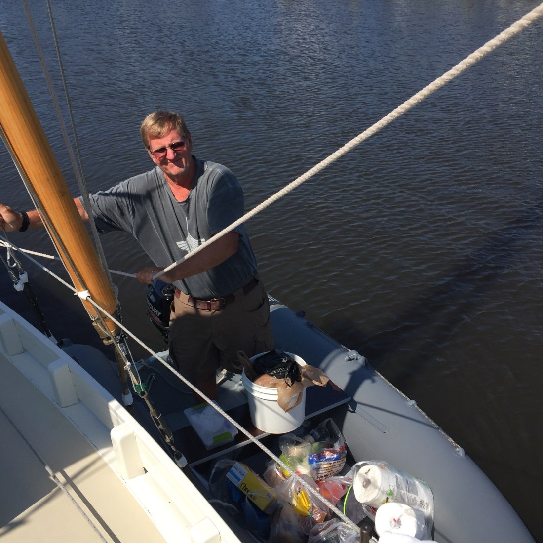 Since we are short on sailing tales, we decided to share some of the challenges of living on a boat. Grocery shopping has been an adventure. We have purchased more food from 7/11 type stores the past 5 weeks than in 38 years of marriage. In Pirates of the Caribbean, Captain Jack wants to know “why is the rum always gone” its because there are no liquor stores within walking distance of the waterfront! Total strangers have offered us rides to the boat after watching us carry several bags in 90 degree heat. Before purchasing an item, I now consider the weight. When mooring out, you load everything into the dingy then put it on the boat before putting it away. Much easier to jump in the car and run to Krogers!