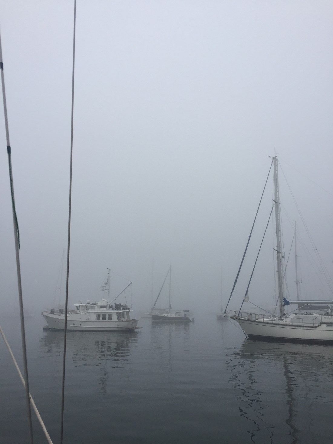 Being alone on the boat moored offshore is a very strange feeling. Two people on a boat the size of Thistle have to be a close team or it won’t work. Last night about midnight was dead calm with thick fog. The boat wasn’t moving at all and the fog seemed to silence the sounds of the night. I was just about asleep when something banged into the side of the boat making a big splash and sending me up on deck with a flashlight. Quite large fish were feeding on smaller bait fish and in the frenzy one banged into the boat. My first thought was Sharon would have been amazed. Single handed racing would be an exciting challenge but cruising is about sharing the experience. I’m really glad we can help out Eric and Sawyer but it will be nice to have Sharon back once Elo is healed.